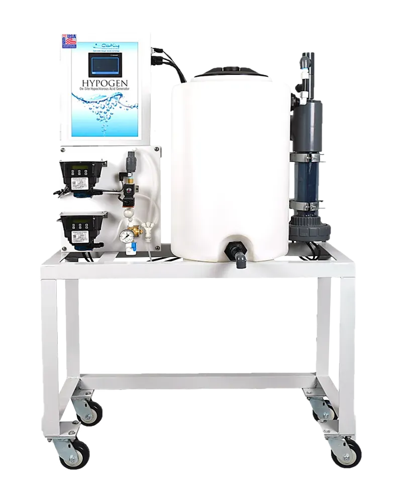 HYPOGEN de Chlorking® produce ácido hipocloroso a 1000ppm con un pH de entre 5 y 7. El sistema utiliza alimentadores de sal e interruptores de nivel para automatizar el proceso de producción. A medida que usa la solución, el sistema se enciende automáticamente y llena el tanque de almacenamiento. El sistema HYPOGEN utiliza celdas de polaridad inversa, por lo que no es necesario limpiar las celdas.